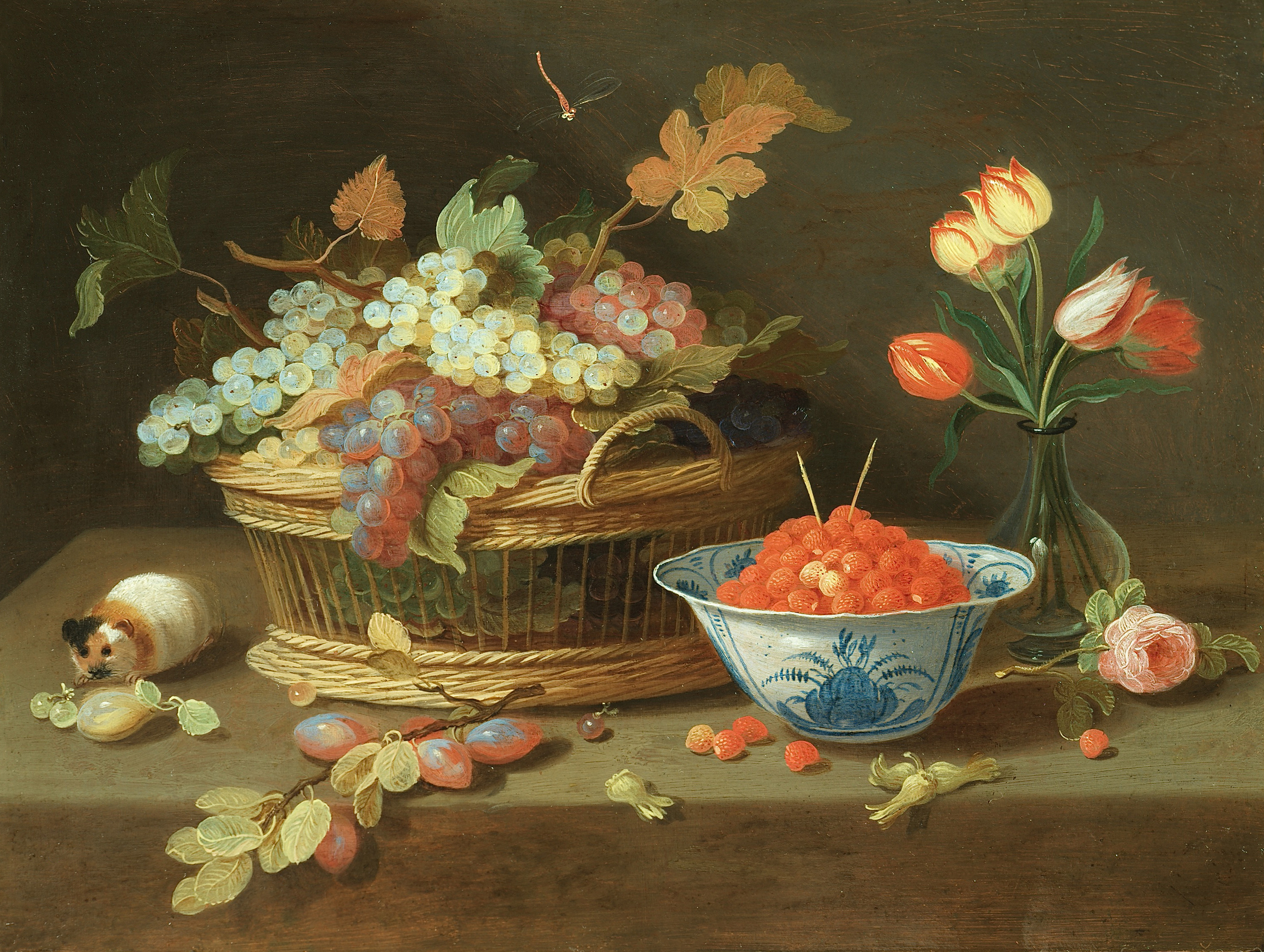 An arrangement of flowers in a vase and a wangli bowl with a Chinese quail & A basket of grapes, a bowl of strawberries and a bouquet of tulips with a guinea pig
