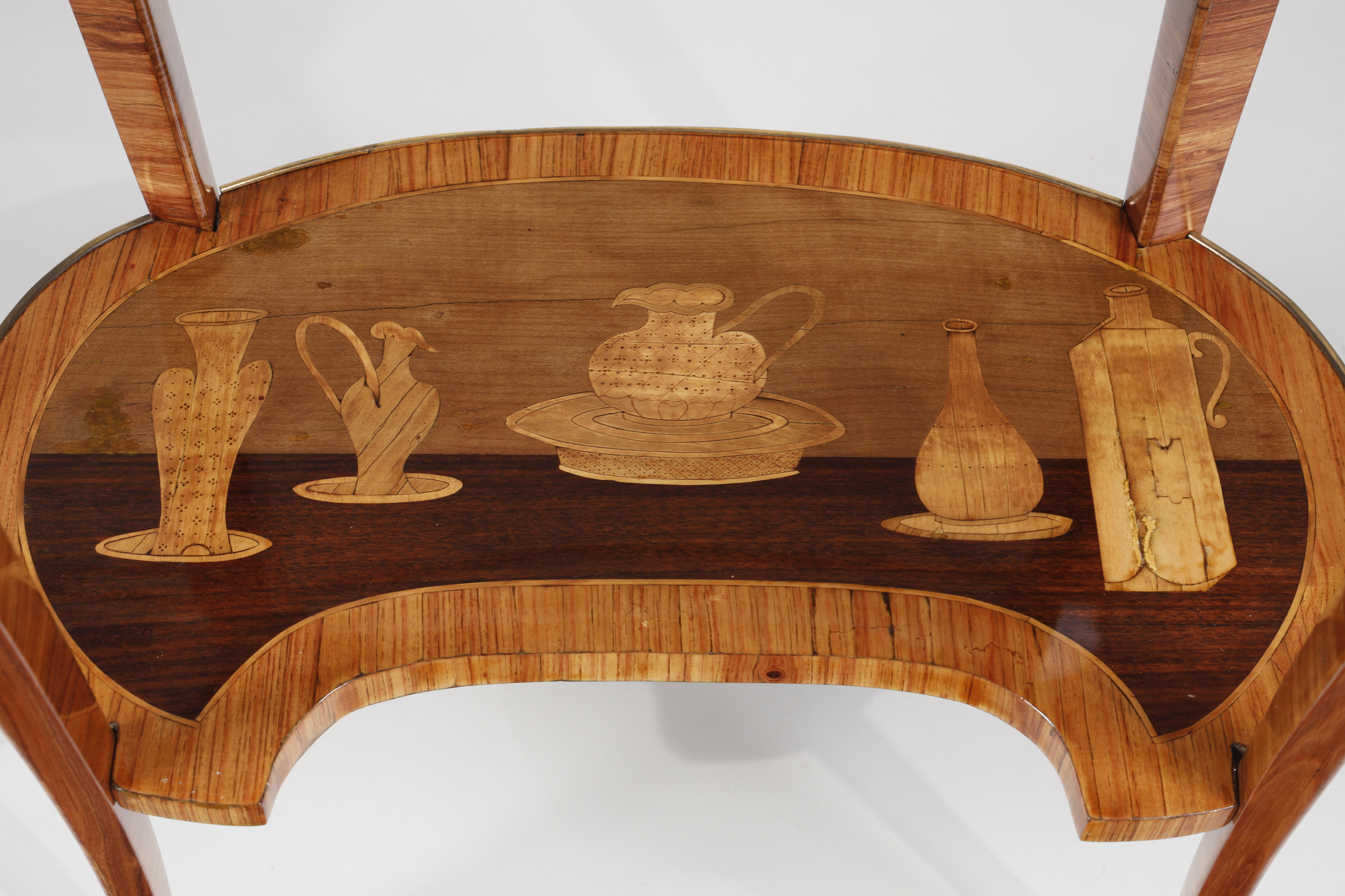 Beneath these elements, a semi-circular tray displays a beautiful still life marquetry, where vases, cups and flowers intertwine in a harmonious composition. Each vase is decorated with geometric and floral symbols, suggesting a work of great finesse. The marquetry decoration follows the circular shape and is framed by a thin band of elm and rosewood surrounded by a gilt bronze moulding.