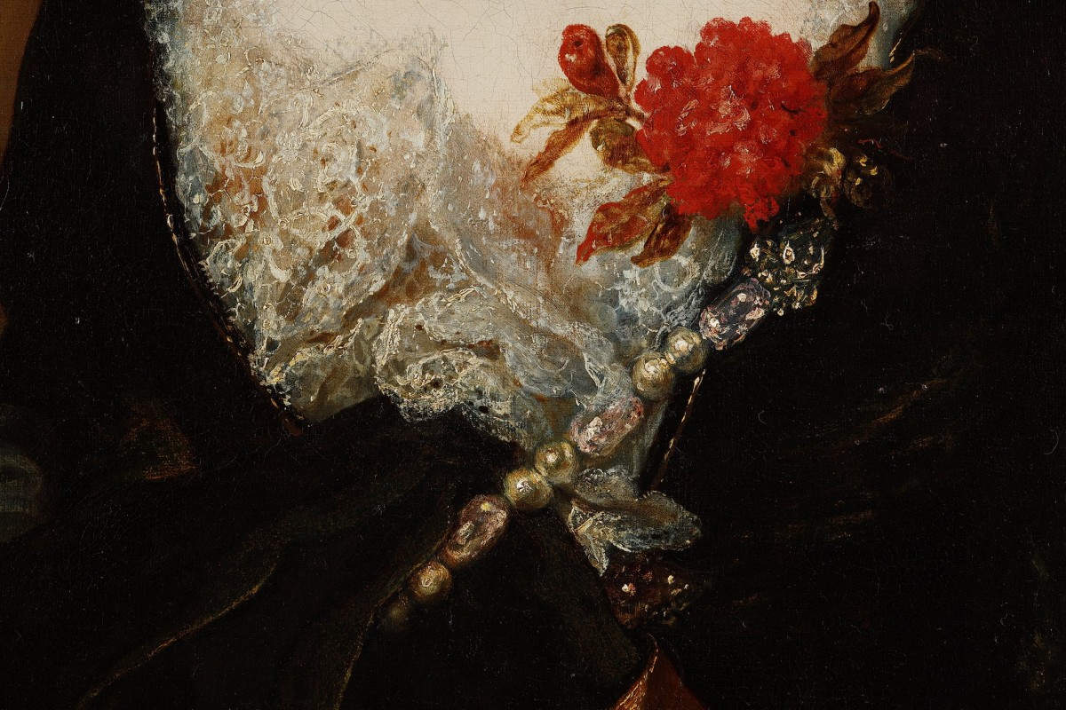 Largillière regularly plays with the interplay of materials; here, the light and delicate lace contrasts with the denser fabric of the dress, the almost transparent pearls harmonise with the barely perceptible, translucent ribbon tied around her right arm, and the flower, with its dynamic form and shimmering colour, refines this harmony and echoes the red ornamentation holding a pearly bead in her hair. Finally, her grey-white hair is styled in an elaborate manner typical of Largillière’s paintings, adorned with a golden ribbon that appears to be of the same material as the fabric.